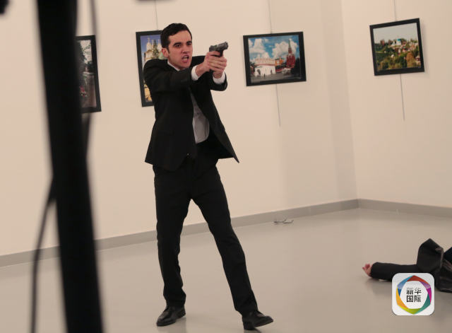 12月19日晚,俄羅斯駐土耳其大使安德烈·卡爾洛夫在土耳其首都安卡拉出席一個活動時遭槍擊。這是槍手在現場。(新華/美聯)