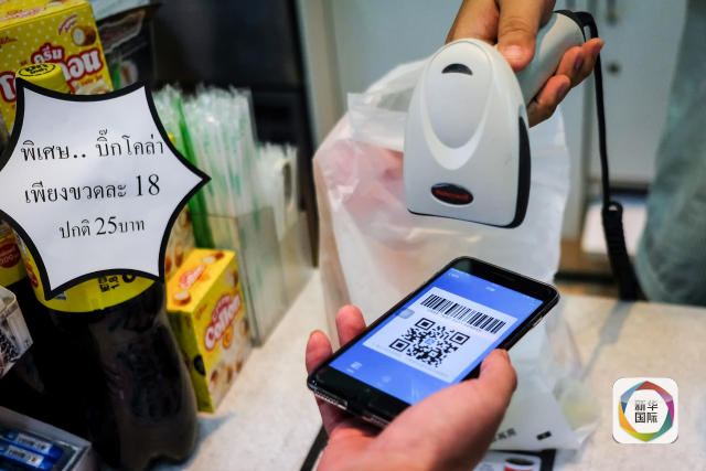 2016年12月9日,在泰國曼谷街頭一家便利店,店員掃描一名中國遊客手機上的支付寶客户端條碼,直接收取貨款。新華社記者李芒茫攝