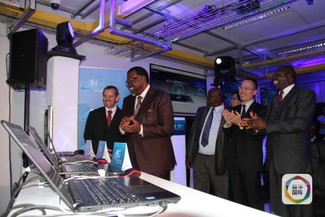 2016年4月14日,在納米比亞首都温得和克,納米比亞總統根哥布(左二)出席4.5G網絡測試儀式。 新華社記者吳長偉攝