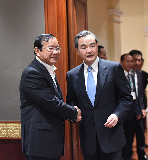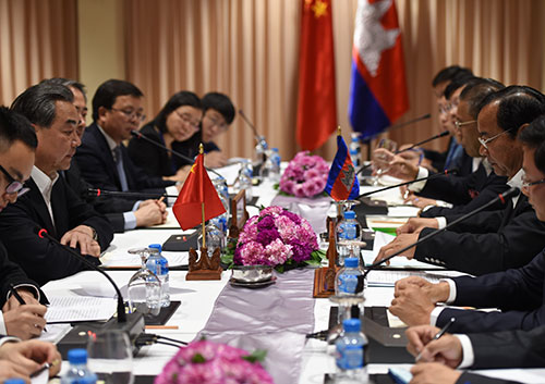 王毅指出,今年中柬關係經歷了國際風雲考驗,路遙知馬力,烈火見真金。我們珍視雙方始終相互支持,為維護地區穩定主持公道、堅持正義。習近平主席對柬埔寨的國事訪問弘揚了中柬傳統友誼,加強了兩國戰略合作,規劃了兩國全方位合作的新藍圖。中方讚賞柬方積極支持“一帶一路”倡議,希望雙方加快商籤合作規劃綱要,繼續推進重點項目建設。