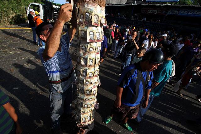 在委內瑞拉塔奇拉州的聖克里斯托瓦爾,人們將退出流通的100玻利瓦爾紙幣貼在柱子上,抗議國內現金供應嚴重不足。(圖片來源:新華社)