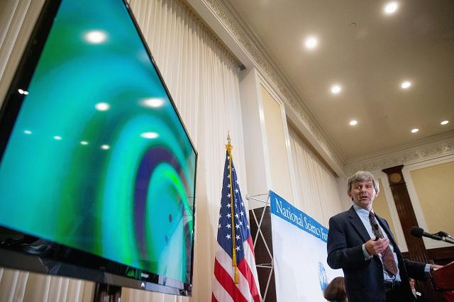 2016年2月11日,在美國首都華盛頓舉行的新聞發佈會上,美國“激光干涉引力波天文台”(LIGO)執行主任戴維·賴茨向媒體展示兩個黑洞合併產生的引力波信號圖像。 美國加州理工學院、麻省理工學院以及LIGO的研究人員當天在華盛頓舉行記者會,宣佈他們利用LIGO探測器於2015年9月14日探測到來自於兩個黑洞合併的引力波信號。引力波是愛因斯坦廣義相對論實驗驗證中最後一塊缺失的“拼圖”,它的發現是物理學界里程碑式的重大成果。(新華社/美聯)