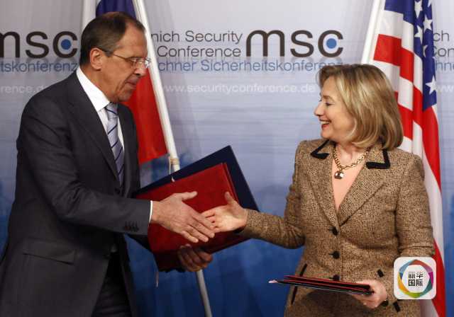 2011年2月5日,美國時任國務卿希拉里·克林頓(右)與俄羅斯外長拉夫羅夫在德國慕尼黑交換文件並握手。美俄新的核裁軍條約《削減和限制進攻性戰略武器條約》由此正式生效。新華社/路透