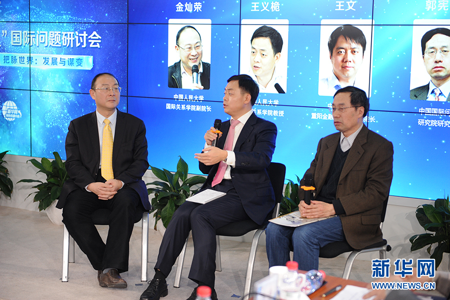12月26日,新華網第七屆“縱論天下”國際問題研討會在北京舉行。這是中國人民大學國際關係學院副院長金燦榮(左)、中國人民大學國際事務研究所所長王義桅(中)和中國國際問題研究院研究員郭憲綱(右)參加研討會的互動環節。新華網 孫韜 攝