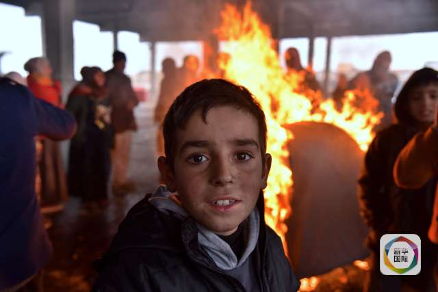 12月18日,在敍利亞北部城市阿勒頗市吉卜林臨時安置點,一名從反政府武裝控制區撤出的兒童在火堆旁取暖。 (新華社記者楊臻攝)