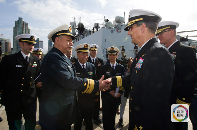 12月6日,在美國聖迭戈港,中國海軍編隊指揮員黃新建少將(前左)與美國海軍第九航母打擊大隊司令拜納姆准將(前右)在歡迎儀式上握手。 (新華社記者楊磊攝)