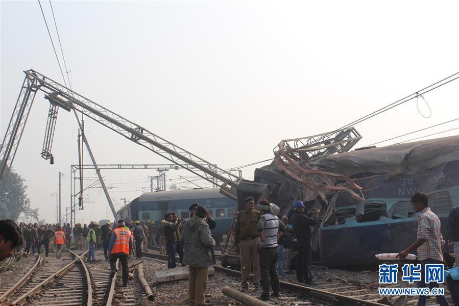 12月28日,在印度北方邦坎普爾地區,人們聚集在火車脱軌事故現場。印度警方28日説,一輛快速列車當天在途經北方邦坎普爾地區時脱軌,導致至少2人死亡、43人受傷。新華社發