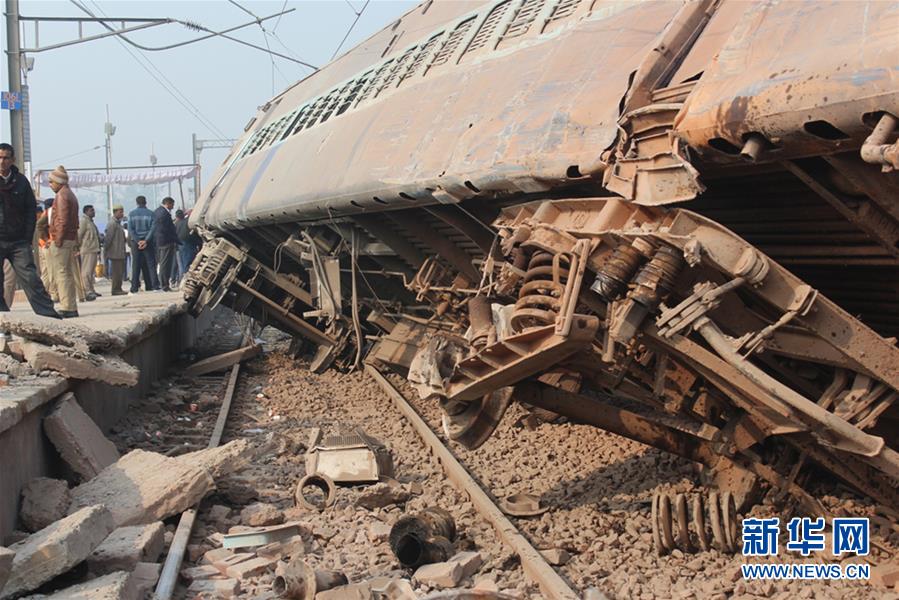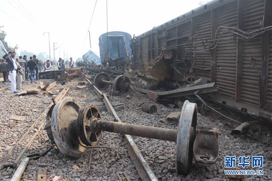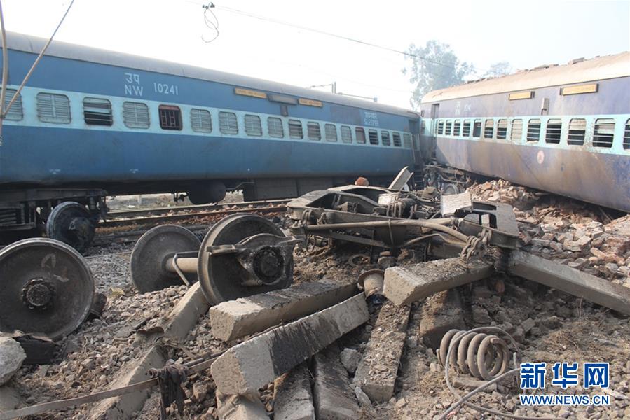 這是12月28日在印度北方邦坎普爾地區拍攝的火車脱軌事故現場。印度警方28日説,一輛快速列車當天在途經北方邦坎普爾地區時脱軌,導致至少2人死亡、43人受傷。新華社發