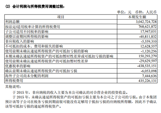 公告披露,福耀玻璃2015年度的利潤總額是304272.47萬元,如按照美國的40%税率計算,應交企業所得税是121708.98萬元,但是福耀玻璃披露的所得税費用是這樣的: