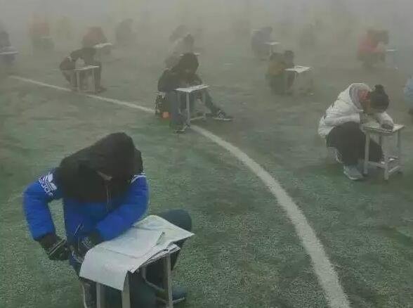 在上一場霧霾中,河南省安陽地區空氣嚴重污染,林州市教體局在12月19日下發了全市中各中小學、幼兒園停課通知。然而,12月20日上午,林州市臨淇一中竟然組織幾百名初三學生在操場上進行考試。(資料圖)