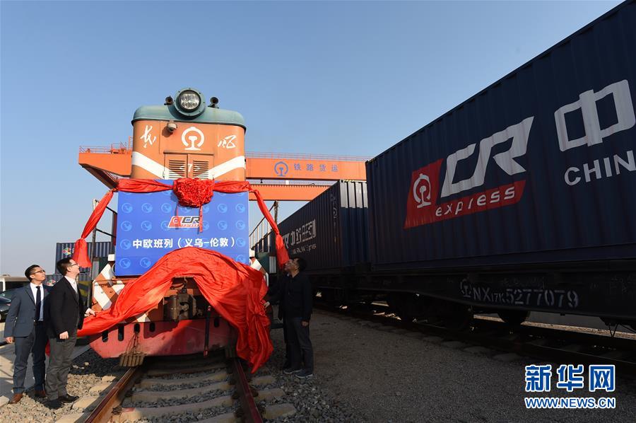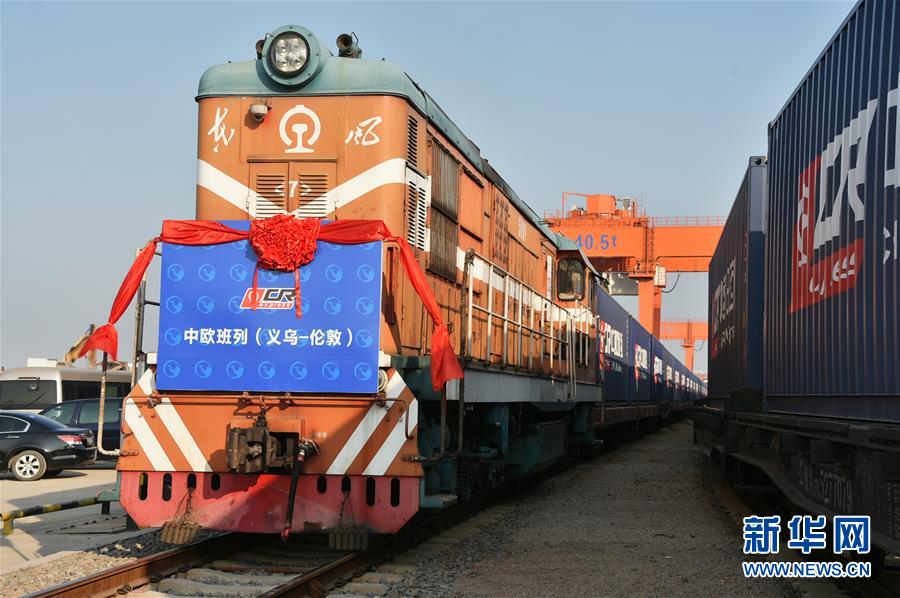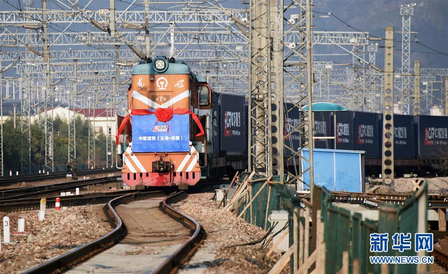 12月31日,首趟開往英國倫敦的中歐班列在浙江義烏鐵路西站舉行發車儀式。12月31日24時,首趟義烏至倫敦中歐班列將從浙江義烏啓程開往倫敦。該班列共搭載88箱貨物,主要為服裝、襪子等小商品,貨值約3500萬元人民幣。班列將由阿拉山口出境,途經哈薩克斯坦、俄羅斯、白俄羅斯、波蘭、德國、比利時、法國等國,經英吉利海峽隧道,最終抵達英國倫敦,全程12451公里,預計運行時間18至20天。新華社發(龔獻明 攝)