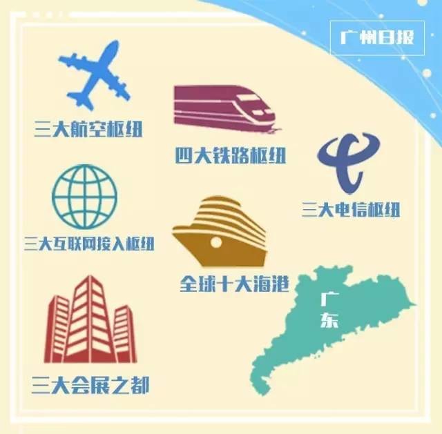 廣州是全國公認的三大航空樞紐、三大會展之都、三大電信樞紐、三大互聯網接入樞紐(大陸58%的互聯網通過廣州與世界對接)、四大鐵路樞紐、全球十大海港……