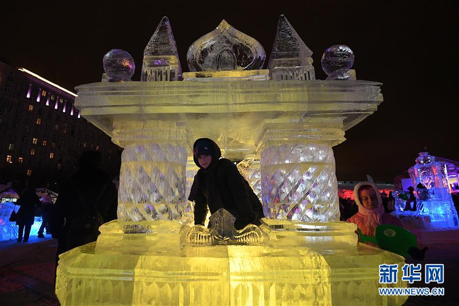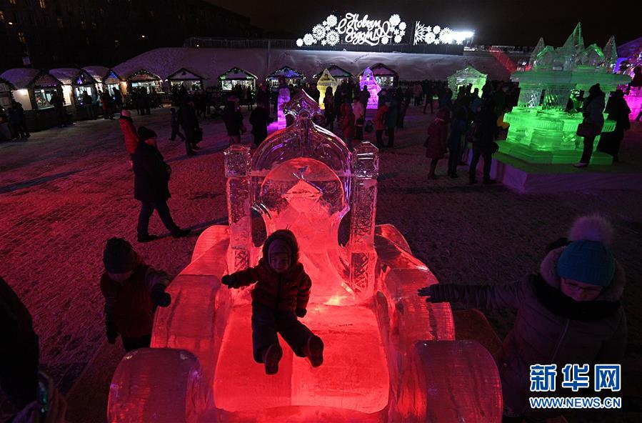12月29日,在俄羅斯首都莫斯科,兩名兒童遊覽冰雕作品。當天,2016年“冰雪莫斯科·闔家團圓”新年冰雕藝術節在莫斯科俯首山開幕,活動將持續至2017年1月8日。新華社/衞星社