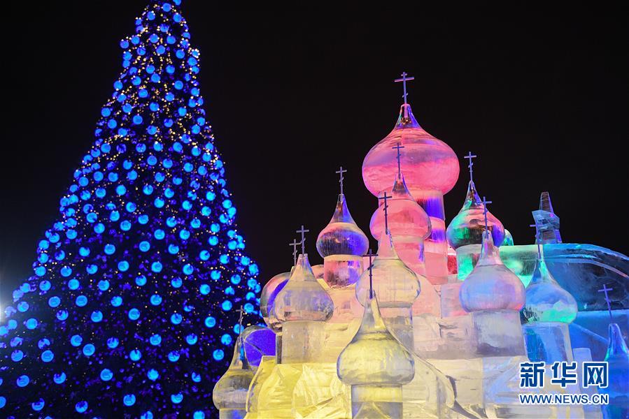 這是12月29日在俄羅斯首都莫斯科冰雕展上拍攝的克里姆林宮和聖誕樹冰雕作品。當天,2016年“冰雪莫斯科·闔家團圓”新年冰雕藝術節在莫斯科俯首山開幕,活動將持續至2017年1月8日。新華社/衞星社