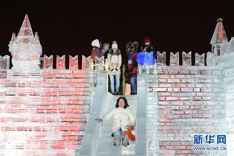 12月29日,在俄羅斯首都莫斯科,幾名遊客登上冰雕城堡參觀。當天,2016年“冰雪莫斯科·闔家團圓”新年冰雕藝術節在莫斯科俯首山開幕,活動將持續至2017年1月8日。新華社/衞星社