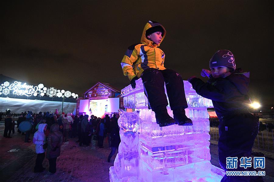 12月29日,在俄羅斯首都莫斯科,孩子們在冰雕上玩耍。當天,2016年“冰雪莫斯科·闔家團圓”新年冰雕藝術節在莫斯科俯首山開幕,活動將持續至2017年1月8日。新華社/衞星社