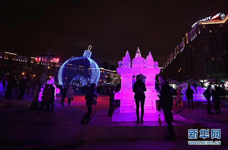12月29日,在俄羅斯首都莫斯科,遊客遊覽冰雕小鎮。當天,2016年“冰雪莫斯科·闔家團圓”新年冰雕藝術節在莫斯科俯首山開幕,活動將持續至2017年1月8日。新華社/衞星社