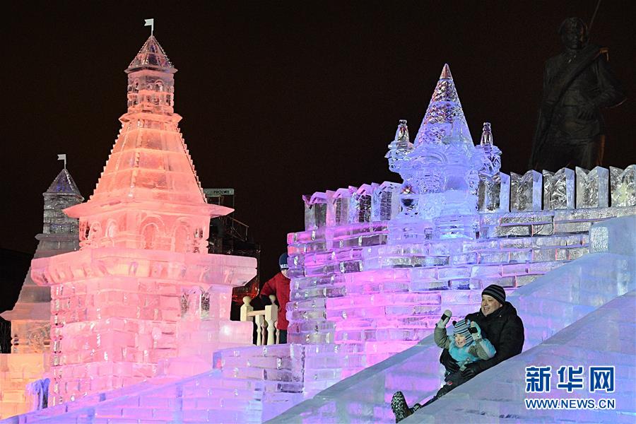12月29日,在俄羅斯首都莫斯科,一名遊客帶着孩子在冰雕上滑滑梯。當天,2016年“冰雪莫斯科·闔家團圓”新年冰雕藝術節在莫斯科俯首山開幕,活動將持續至2017年1月8日。新華社/衞星社