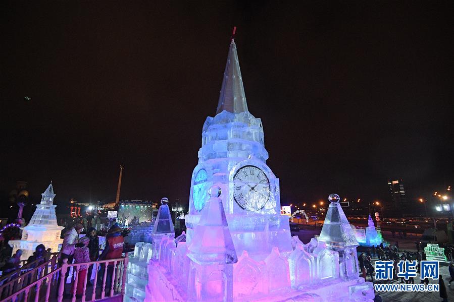 12月29日,在俄羅斯首都莫斯科,遊客在冰雕城樓前參觀。當天,2016年“冰雪莫斯科·闔家團圓”新年冰雕藝術節在莫斯科俯首山開幕,活動將持續至2017年1月8日。新華社/衞星社