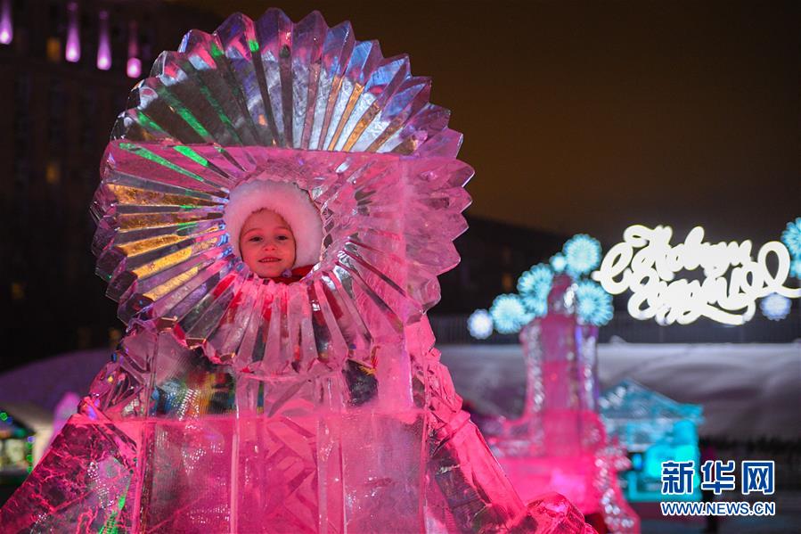 12月29日,在俄羅斯首都莫斯科,一名兒童與冰雕合影。當天,2016年“冰雪莫斯科·闔家團圓”新年冰雕藝術節在莫斯科俯首山開幕,活動將持續至2017年1月8日。新華社/衞星社
