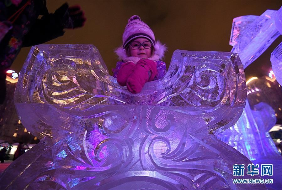 12月29日,在俄羅斯首都莫斯科,一名女孩與冰雕作品合影。當天,2016年“冰雪莫斯科·闔家團圓”新年冰雕藝術節在莫斯科俯首山開幕,活動將持續至2017年1月8日。新華社/衞星社