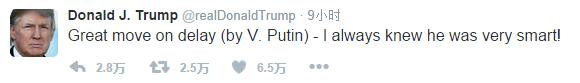 特朗普發推文説:“普京延遲行動實在太棒了──我一直知道他非常聰明!” (Great move on delay (by V. Putin) - I always knew he was very smart!)不過,特朗普口中指的“延遲”(delay),意思不明。