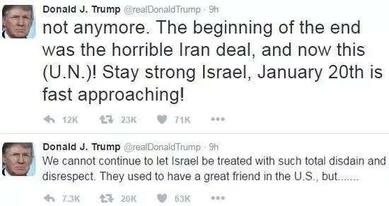 還未上任、本不該插手敏感外交問題的特朗普按捺不住,在推特上發聲,“不能繼續讓以色列受到這樣的蔑視和不恭敬對待,美國過去是以色列的好友,但不再是了。可怕的伊核協議終結了友誼。要堅強,以色列,1月20日很快就要來了。”