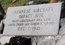 飯田房太石碑其實是1971年美國人安放在其墓地的一塊石頭説明,以示和其他美軍士兵墓地的區別。石塊上只刻有“日本軍機撞擊墜毀點,飛行員飯田大尉、第三制空隊指揮官,1941年12月7日”。