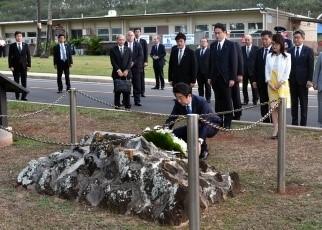 日本共同社報道,12月28日(當地時間27日)上午,安倍晉三、日本外交大臣岸田文雄、防衞大臣稻田朋美抵達美國夏威夷火奴魯魯希卡姆空軍基地,先後前往美國太平洋國家紀念公墓、麥基基日本海軍墓地和“愛媛丸”號遇難船隻慰靈碑獻花。這裏尤為值得關注的是,安倍當天下午特意前往日本帝國海軍中佐飯田房太“紀念碑”獻花。