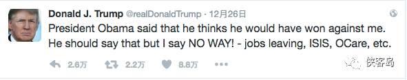 這還了得?特日天立馬錶示不服,連發幾條推特,歷數奧巴馬的“罪過”,比如“你這幾年讓ISIS坐大”、“美國的失業率和失敗的醫改”,“你要是參選你穩輸”!