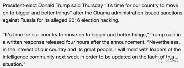 事發後4小時,特朗普就寫了一份書面回應:“是時候(放下這事兒)去做其他更偉大的事情了。不過,為了我們國家和人民的利益,我會在下週跟情報機構的負責人們見面,從而獲取這件事(俄羅斯黑客干涉選舉)的最新進展”。看上去還蠻平靜的語調,裏面都是對奧巴馬這麼急匆匆行事的不滿。