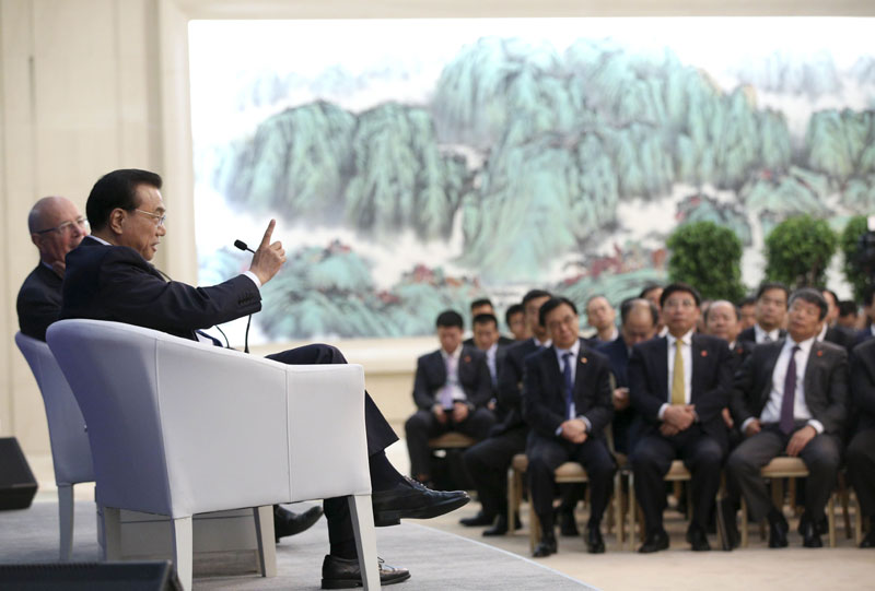 6月28日上午,國務院總理李克強在天津梅江會展中心同出席2016年夏季達沃斯論壇的300多名各國企業家代表舉行對話會。總理就中國經濟形勢、結構性改革、製造業升級、金融和資本市場等問題做了一一回應。李克強強調,中國將繼續按照市場化、法治化方向推動資本市場發展,完善金融監管,防範系統性、區域性金融風險。