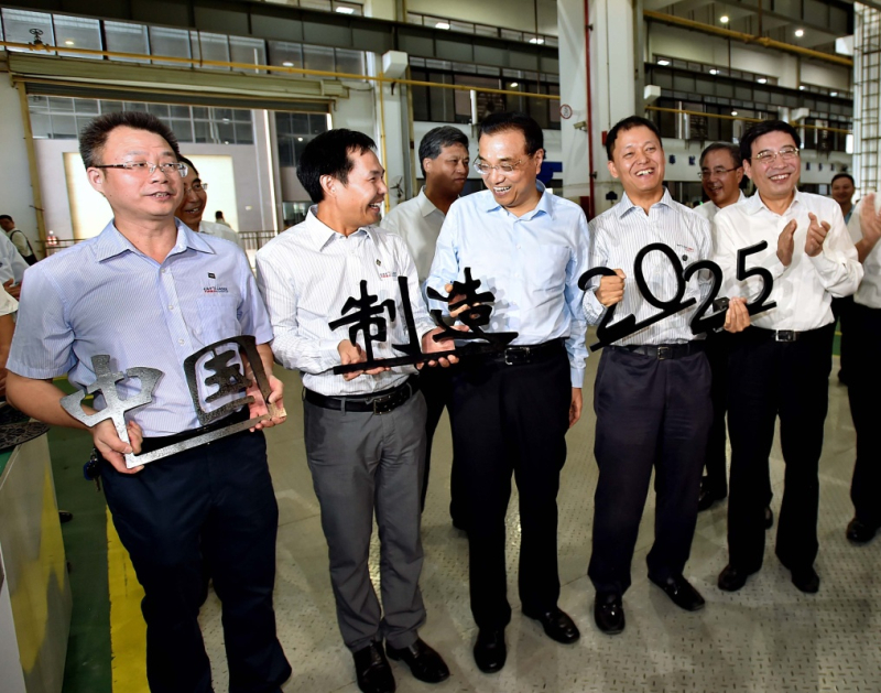 10月13日,深圳大族激光車間內,一個激光切割的“中國製造”字樣送到李克強手裏。總理仔細端詳説,工藝很好不過應加上“2025”。工人笑答已做出來了,並端着它與總理合影。李克強鼓勵員工,“中國製造2025”大有希望,要在你們手上大放光芒。