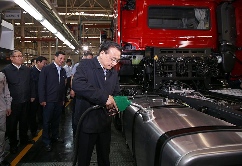 5月23日,在東風商用車重卡新工廠,李克強總理為裝配線上一輛紅色重型卡車的油箱加滿了油。