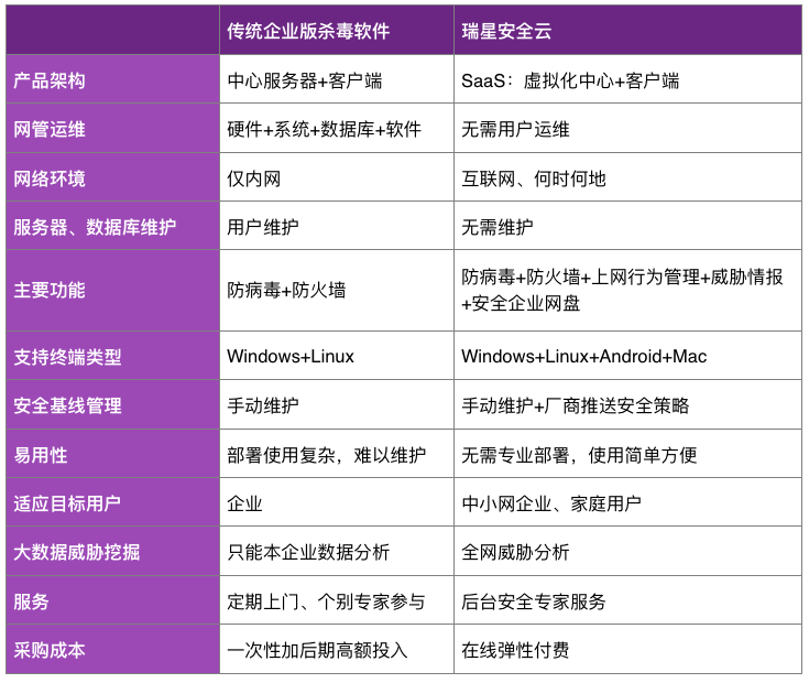 近年來,大量網絡安全事件被曝光,中小企業的風險意識已經有所提升,但由於公司內沒有專門的服務器,且終端設備呈現多元化、多平台的特點;硬件分佈零散、移動性強,專業人員也相對缺失。另外,中小企業預算有限,所以很難對其自身網絡安全進行有效的保護與管控。為此,瑞星安全雲的SaaS模式從根本上解決了這一問題。中小企業只要可以接入互聯網,就能通過互聯網直接獲取安全服務,無需投入服務器、帶寬、專業安全運維人員。