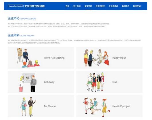 “企業文化”是北京現代汽車金融官網上的一大亮點,通過全面展示公司豐富多彩的培訓計劃、社團活動、公司福利等內容,精彩展示了行業領先的整體公司面貌和區別其他企業的企業文化風采。從CEO定期的面對面溝通,到商務禮儀、儀容儀表,再到種類繁多的社團活動和真正提升員工生活品味及綜合素質的業餘生活活動,體現了北京現代汽車金融在人才培養方面的獨到見解和發展思路。