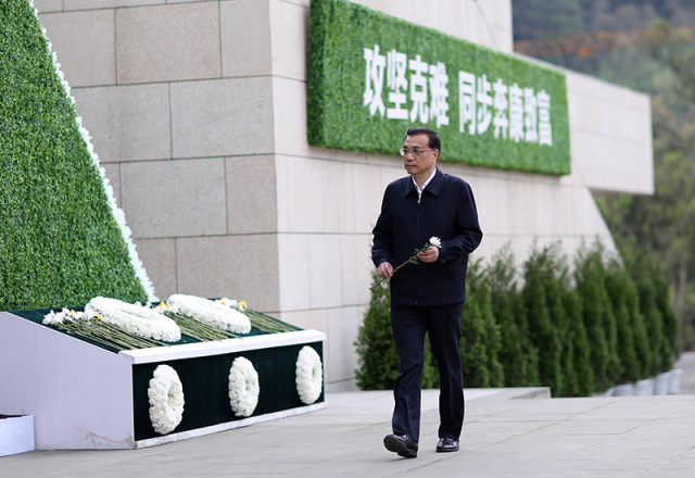 三年後,李克強再來蘆山,4月24日首先前往祭奠遇難同胞和抗震救災中英勇獻身的烈士。李克強緩步走上台階,俯身輕輕把一支鮮花放在“4?20”蘆山強烈地震紀念館前的紀念台上。枱面鐫刻着196名遇難同胞的姓名。總理在紀念台前深深鞠躬,默哀一分鐘。現場肅穆,哀思凝重。