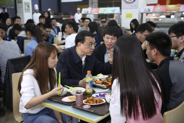 4月15日傍晚,當李克強出現在北大農園食堂時,整個大廳氣氛頃刻達到沸點,同學們爭相上前與總理握手、拍照。李克強端着餐盤選好菜後坐到學生中間。從食堂菜價貴不貴到國家助學金夠不夠用,從宿舍住宿條件到同學們的論文選題,總理興致勃勃與大家邊吃邊聊了半個多小時。