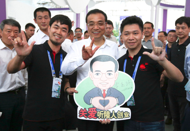 10月12日下午李克強總理來到全國雙創周深圳主會場。在一位聽障創業團隊負責人示範下,總理也打出“愛”的手勢。李克強對這一創業團隊給予特殊關注,並應邀在“關愛聽障人創業”畫板上籤上自己的名字。