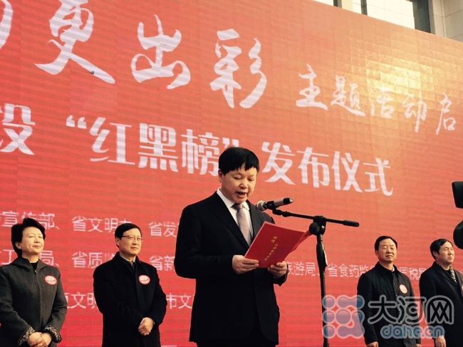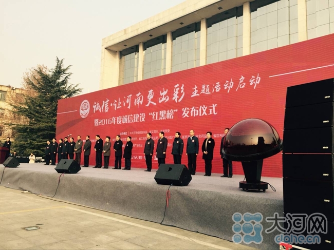 大河網訊(記者 安豔鴿)為大力培育和踐行社會主義核心價值觀,積極營造誠實守信的社會環境,根據中央及河南省關於誠信建設制度化的部署要求,12月30日下午,由河南省委宣傳部、省文明辦、省發改委等15家單位聯合舉辦的“誠信·讓河南更出彩”主題活動題活動暨2016年度誠信建設“紅黑榜”發佈儀式在省人民會堂廣場舉行。省委常委、宣傳部長、省文明委副主任趙素萍,省委宣傳部常務副部長、省文明辦主任王耀參加了發佈儀式。