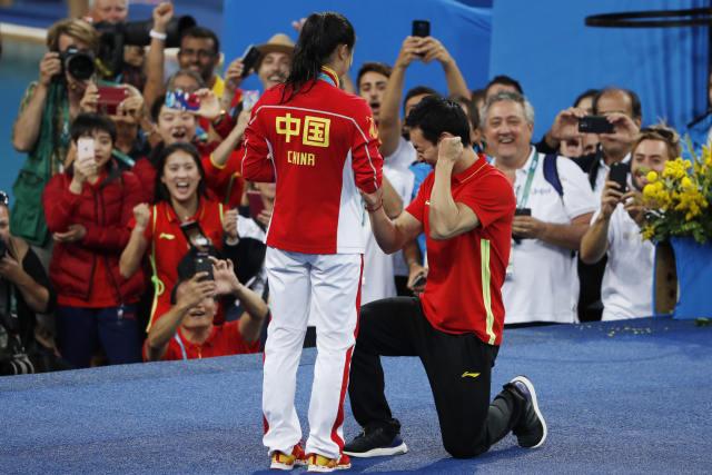 一個單膝跪地、握拳慶祝,一個輕輕點頭表示應允。這場愛情這場長跑的冠軍在那一刻屬於秦凱何姿*↑新華社記者費茂華攝*