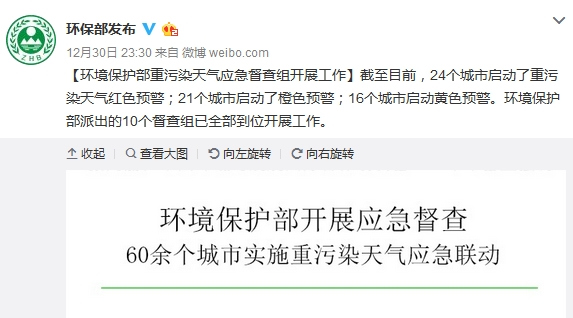據環保部宣教司官方微博消息,環保部昨日深夜通報重污染天氣應急督查組開展工作情況。環保部稱,截至目前,24個城市啓動了重污染天氣紅色預警;21個城市啓動了橙色預警;16個城市啓動黃色預警。環境保護部派出的10個督查組已全部到位開展工作。