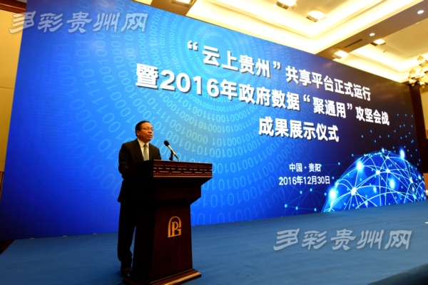 多彩貴州網訊(本網記者 林童 見習記者 趙紫怡)12月30日,“雲上貴州”共享平台正式運行暨2016年政府數據“聚通用”攻堅會戰成果展示儀式在貴陽舉行。省委副書記、省長孫志剛出席儀式併為“雲上貴州”共享平台正式運行按下“啓動鍵”。省委常委、常務副省長秦如培出席儀式並主持,省委常委、副省長慕德貴出席。
