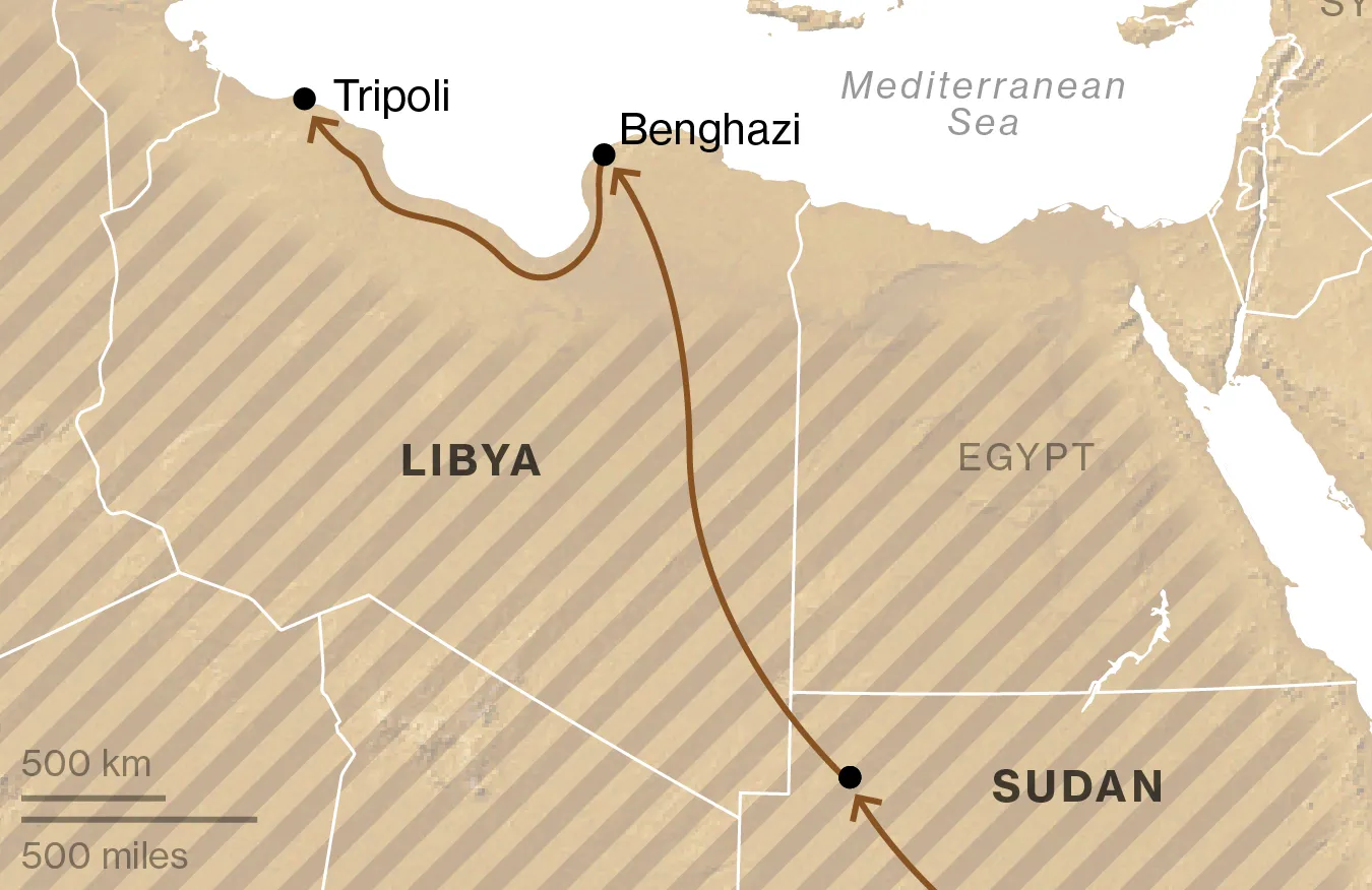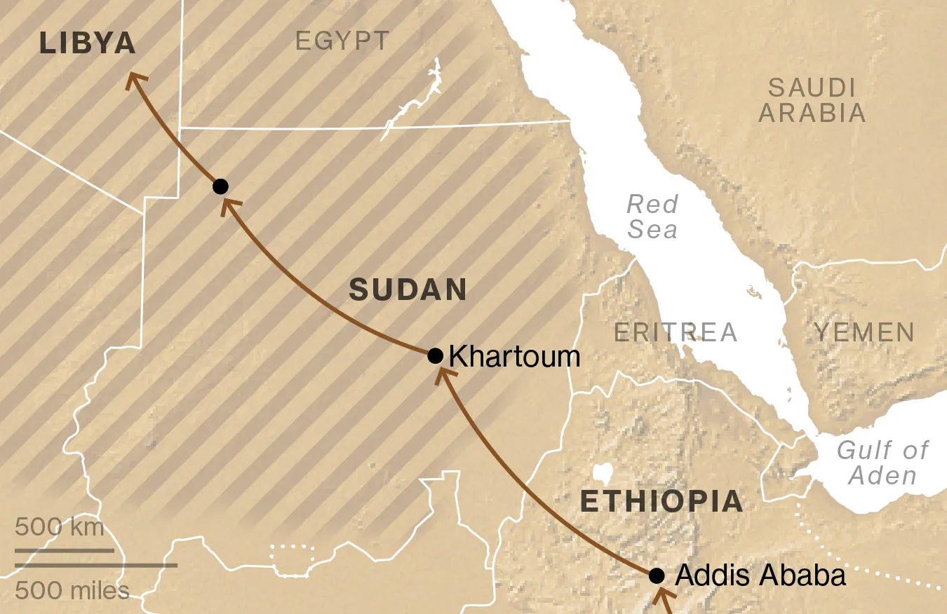走私者將艾哈邁德帶過埃塞俄比亞邊界,送到亞的斯亞貝巴。過去幾年利比亞的混亂為通往歐洲打開了一條路徑,艾哈邁德的旅程是典型的。他通過中央地中海路線前往意大利,這條路線可以從非洲深處開始。走私者將他帶到亞的斯附近的一個城鎮,並把他安置在一家餐館裏,他在那裏洗了九個月的碗,賺取每月20美元。沿着移民路線,幾乎沒有報酬的工作很常見;許多走私者將移民視為廉價勞動力。當時機成熟時,他繼續前行。艾哈邁德無法確定他在埃塞俄比亞遇到的所有人是否屬於同一個網絡,但從索馬里邊界到利比亞,他一直在一個或另一個走私者的手中。
