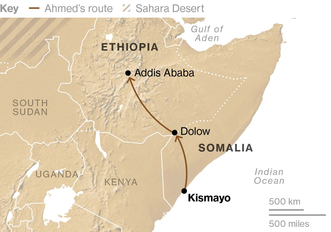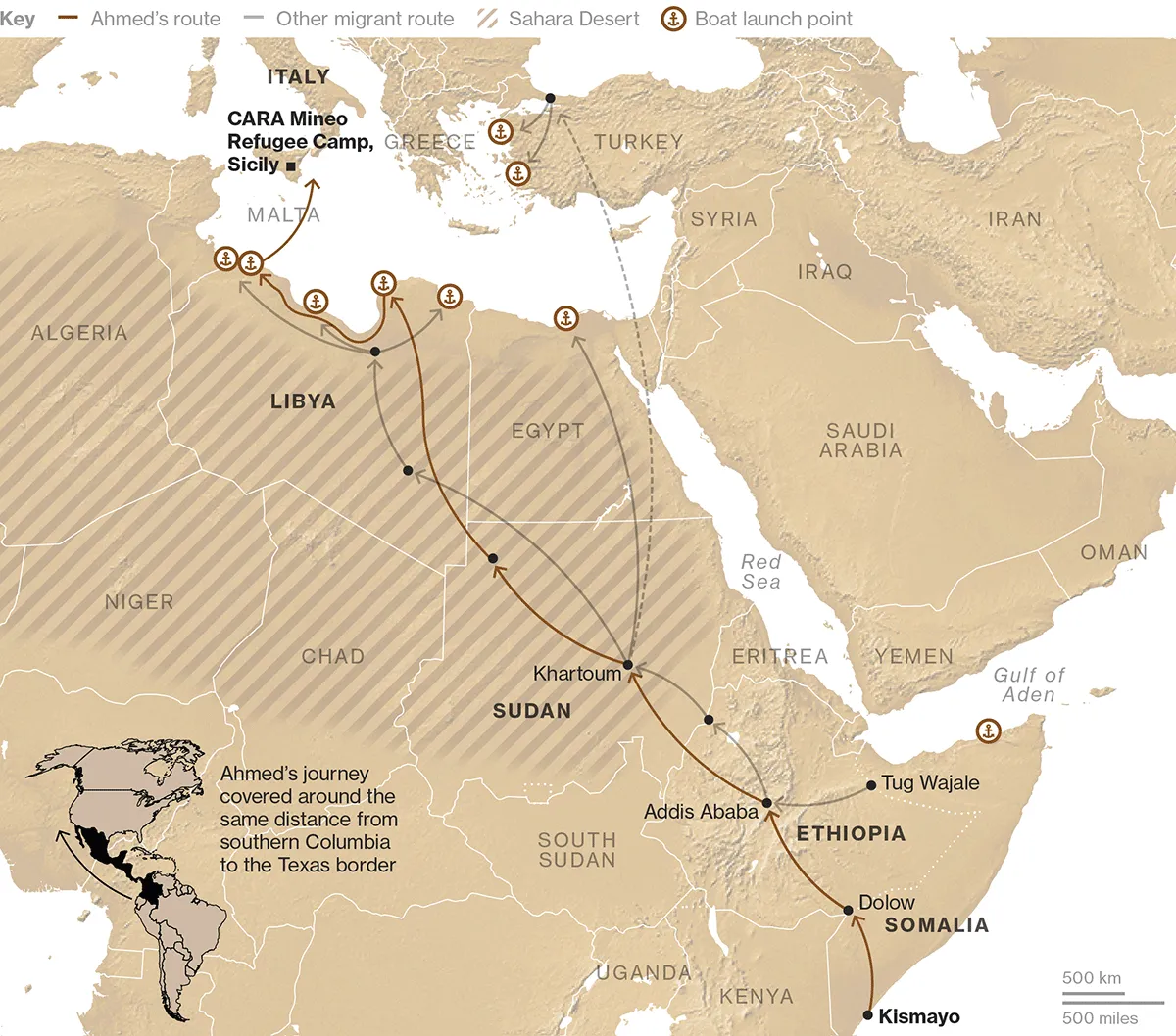 阿赫邁德在離開他位於索馬里南部基斯馬尤附近的村莊時23歲,因工作嚴重匱乏。他在乾燥的索馬里灌木叢中旅行了18天,搖晃在長途卡車的頂部,直到他到達埃塞俄比亞邊界南部的多洛鎮。當地人夜間偷偷帶他越過邊境警衞,穿過朱巴河。這些索馬里走私者——相當於在美墨邊境幫助移民的“土狼”——是他在從非洲之角到歐洲的移民路線中遇到的第一批人,他們是一個龐大的走私者、便利者和暴力敲詐者網絡的一部分。