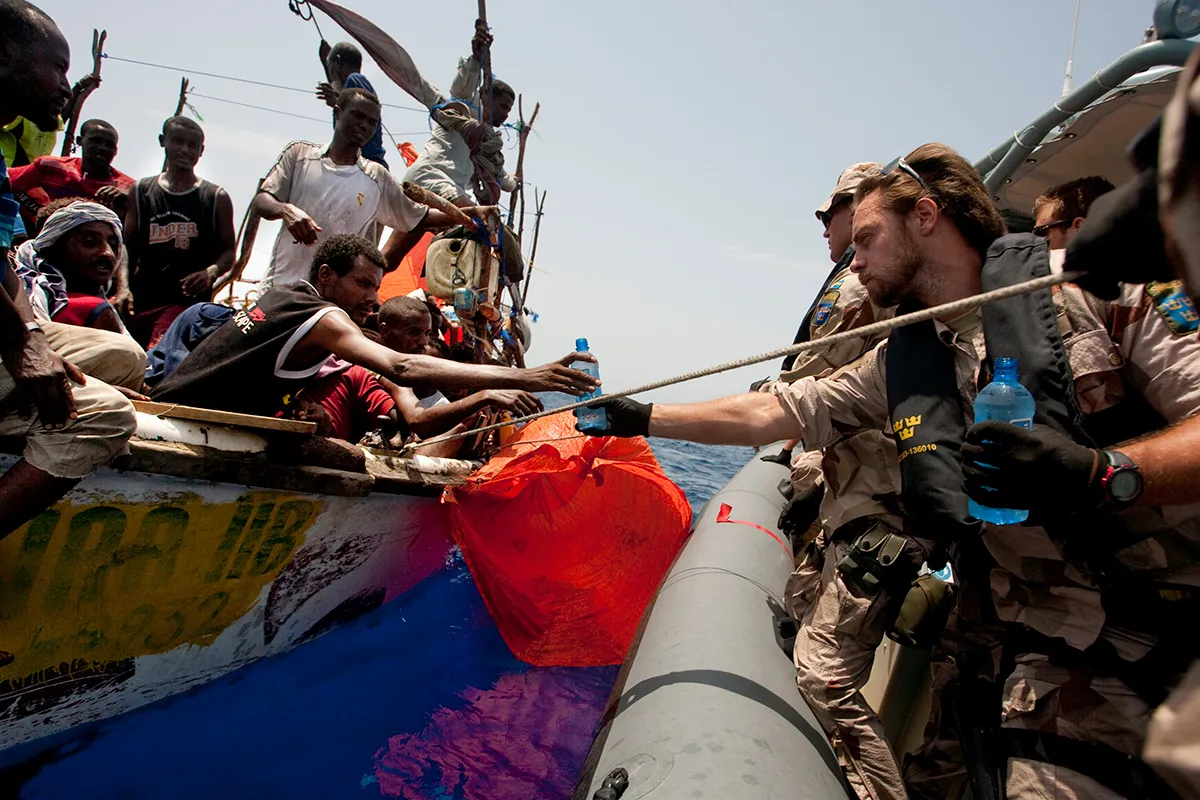 瑞典歐盟海軍部隊護衞艦HSMS Carlskrona在2010年幫助索馬里海員。來源:歐洲聯盟海軍部隊想要獲得歐洲庇護的東非人和比前海盜更糟糕的人打交道。在CARA Mineo,有一個微笑的年輕女性名叫Saynab,臉胖聲音柔和,戴着白色花朵頭巾。去年,她越過埃塞俄比亞, traveled all the way to Bahir Dar,這是一座位於亞的斯亞貝巴和蘇丹邊界之間的古老城市,位於塔納湖邊。她在巴希爾達工作了兩個月,為一名埃塞俄比亞男子打掃房屋和洗衣服,最後他把她轉移到蘇丹邊緣。她在那裏被一名“朋友”囚禁了三個月,這名朋友是埃塞俄比亞男子的朋友,要求支付。當她無法支付時,“一些人來到家裏,”她説,“他們用我的身體來賺錢。持續了八個月。”只有在她懷孕後,他們才允許她繼續前行並登上橡皮船。