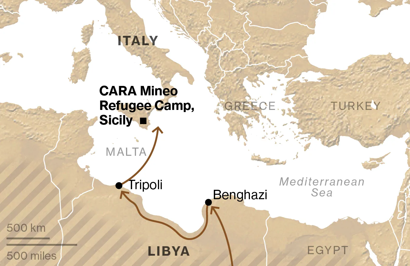 在橡皮艇上漂流了16小時後,艾哈邁德被意大利海岸警衞隊救起,並被帶到西西里的一個難民營。這個營地是一個前美國軍事基地,建在東西西里一個山城的農田和柑橘林之間。多達3000名移民,主要是非洲和中亞人,住在鏈條圍欄後面的亞郊式排屋中。這個奇怪的村莊有高速互聯網和衞星電視,一個陰鬱的自助餐廳,一個臨時教堂和清真寺,以及一些名為憲法大道和德凱圖驅動的短小瀝青街道。一位在這裏工作的索馬里人擔任翻譯和文化調解員,他自己也是一名移民:他在2007年沿着同樣的東非路線離開了索馬里。我稱他為拉希姆。他是一個安靜的年輕人,大約30歲,聲音高亢。通過他的工作,他聽到了大量的故事,他説自從他踏上旅程以來,變化是顯著的。競爭更多,暴力更多,涉及的錢也更多。“九年前我來到意大利時,一切都很簡單。沒有這些走私者,”他説,臉上露出厭惡的表情。“以前很小。走私者曾經很温和。沒有這麼多混亂……現在有人會打你。”