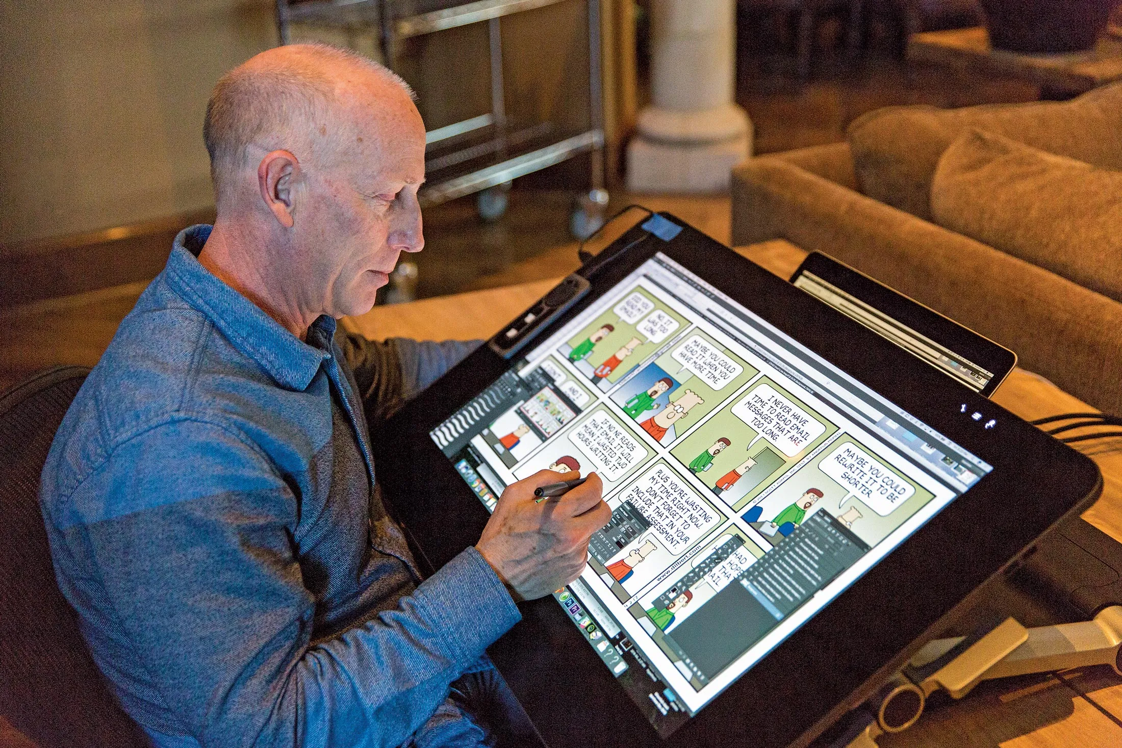 亞當斯每天花幾個小時在家裏畫Dilbert。攝影師:傑夫·敏頓為《彭博商業週刊》拍攝《Dilbert》的靈感來自他對企業生活的憤世嫉俗的看法。“在太平洋貝爾工作時,我大約60%的工作都是在努力看起來很忙,”他在最近的書中寫道,如何在幾乎所有事情上失敗並仍然贏得成功。“我大多數的預算電子表格都有公式錯誤,但這並不重要,因為來自各個部門的所有輸入都是完全的謊言和廢話。如果説有什麼的話,我的錯誤可能平滑了一些廢話,使其更接近真相。”在為太平洋貝爾工作期間,亞當斯大多數天早上4點起牀,花幾個小時畫Dilbert並寫下15次的肯定句:“我,斯科特·亞當斯,將成為一名著名的漫畫家。”他的突破出現在1989年,當時聯合媒體開始連載Dilbert。