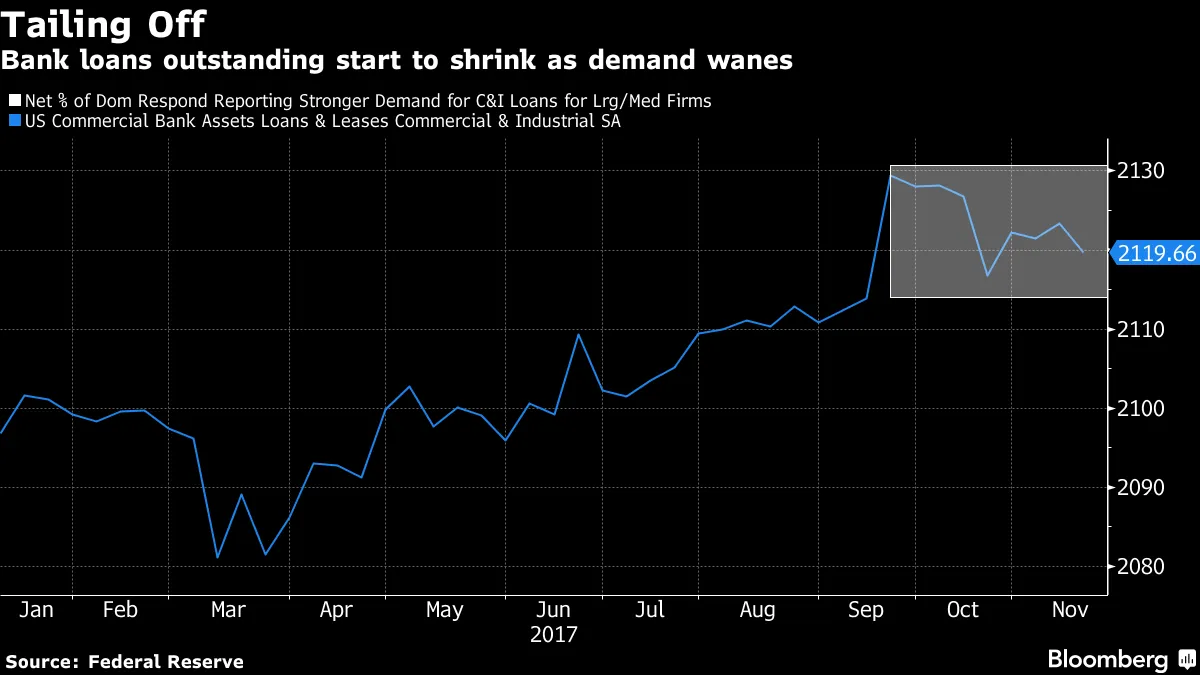 企業貸款令人擔憂如果美國經濟的前景如此光明,那麼如何解釋企業借貸的放緩?2017年,聯邦儲備銀行關於商業和工業貸款的每週數據並不強勁,未償還金額僅增長了1%,而過去六年的平均增長率為9.9%。事實上,自九月底以來,這一趨勢一直在下降。這與不斷創下新高的繁榮股市並不一致,因此投資者可能會面臨一個糟糕的驚喜。The Lindsey Group的首席市場分析師彼得·布克瓦在一份研究報告中寫道,他認為貸款增長放緩有四個原因。首先,公司正在繞過銀行貸款,在資本市場獲得更便宜的融資。其次,基於Libor的貸款變得更加昂貴,公司選擇不借款。第三,企業債務水平相對於GDP和現金流處於歷史高位,導致進一步借款的暫停。第四,公司在税改實際通過之前,正在等待做出重大企業支出決策。在這些原因中,第三個似乎與美聯儲對銀行高級貸款官的季度調查相符,該調查顯示商業和工業貸款的需求已降至2012年初以來的最低水平。