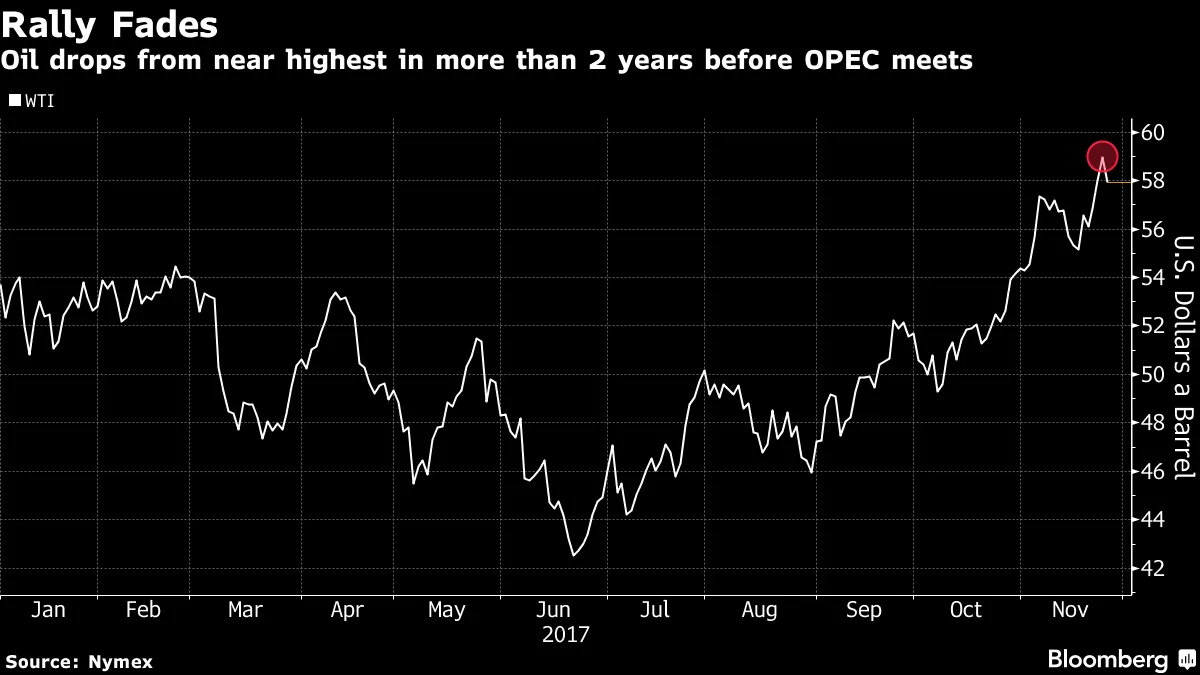 摩根士丹利表示,全球股票即將進入一個“更棘手”的時期,這對多頭沒有幫助。該公司的策略師表示,2018年的股票不太可能超越實際經濟。在標準普爾500方面,他們預計該指數將從週一的2601.42上漲5.7%至2750,並補充説“如果我們在2018年上半年達到這個目標,我們不會感到驚訝”,“這將是今年的高點。”原油崩潰石油也因缺乏跟進而受到影響。OPEC和俄羅斯的成員將在本週在維也納會面,討論延長減產。週末的會議前媒體報道大多集中在卡特爾如何成功抑制產量並將原油價格提升至每桶50美元以上。然而,週一油價下跌了1.29%,至每桶58.19美元。與股票一樣,石油也經歷了大幅上漲,自9月初以來上漲了約23%,而週一的下跌可能只是通往更高價格的暫時調整,但令人擔憂的是分析師對週一原油疲軟的原因。儘管OPEC和俄羅斯制定了延長減產協議至明年年底的框架,但根據參與討論的人士,彭博新聞的凱瑟琳·特雷威克報道,在當前協議於3月到期後,關於減產規模的疑慮仍然存在,以及該集團將採用何種退出策略。同時,針對美國原油的鑽探者上週增加了九個鑽井平台。“我們看到的是在OPEC會議前的猶豫不決,”紐約Stratas Advisors的首席石油市場分析師阿什利·彼得森説。“經過三週的興奮後,投資者開始感到緊張。這將是主導因素,無論每週的基本數據如何。”
